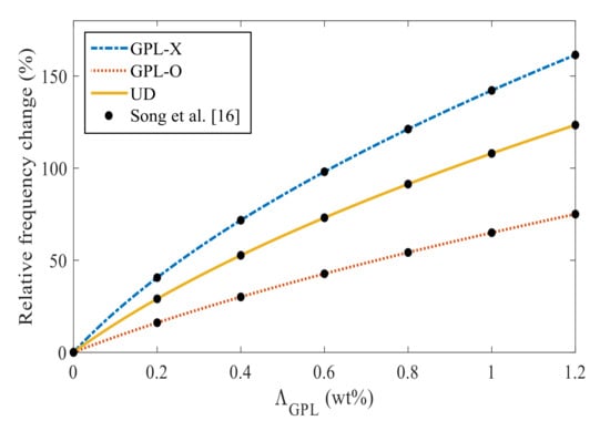 In line with findings by Rafiee et al. [35], the effective Young’s modulus of GPL/polymer nanocomposites is well-approximated by the modified Halpin–Tsai model. The result determined by Equation (1), indeed, is only 2.7% higher than the experimental predictions. Based on the same rule of mixtures, the effective Poisson’s ratio and mass density read as follows: