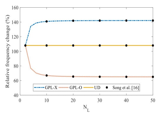 Relative frequency variation vs. the number of layers, for different GPL distribution patterns ( and SSSS boundary condition).