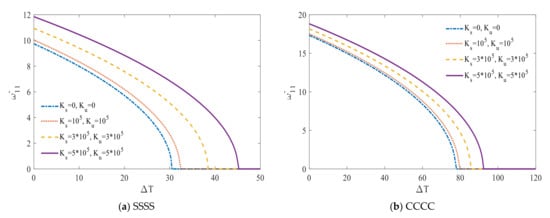 We perform, now, a parametric study focusing on the sensitivity of the frequency response against the weight fraction of GPLs for each selected distribution pattern (Figure 7), with a clear beneficial effect on the structural stiffness and stability as increases within the material. Moreover, due to the presence of high normal stresses in the upper and lower sides of multilayered plates, a GPL-X distribution with an increased quantity of GPLs causes a hardening effect on the system, together with higher natural frequencies. On the other hand, a higher concentration of the reinforcing phase in the middle surface of the plate increases the structural deformability monotonically, whose variation rate is plotted in Figure 7, with a perfect agreement with predictions by Song et al. [16]. A further parameter affecting the frequency response is the number of layers in the structure, as plotted in Figure 8 for three different reinforcement distributions. Except for the uniform reinforcement case for which the response is unaffected by , a small increase of this parameter can cause some hardening or softening effects on the structural stiffness, with a sharp increase or decrease of the frequency, for a GPL-X or GPL-O distribution, respectively. Even for these two distributions, the solutions stabilize for a number of layers equal or higher than 10, as also predicted by Song et al. [16]. The sensitivity of the response to the number of layers in the thickness direction is plotted in Figure 9 in terms of dimensionless vibrational frequency, for a square plate with and under a completely-clamped (CCCC) and simply-supported (SSSS) boundary condition. Based on a comparative evaluation of the plots in these two figures, the best stability response seems to be reached for a CCCC multilayered structure with and a GPL-X reinforcement distribution, in terms of vibration frequency (see Figure 9). At the same time, an increased number of layers more than 10 becomes deleterious for the overall stability of plates with a GPL-O type distribution, both for CCCC and SSSS boundary conditions. Figure 10 depicts the variation of the first vibration frequency against the thermal gradient of moderately thick square plates for different GPL weight fractions. Due to the variation of the thermoelastic properties of the system, together with the presence of initial internal stresses and strains in the structure by thermal attacks, this complex environment causes a combined hardening-softening impact on the system. More specifically, an increased thermal variation decreases the fundamental frequency of the system up to a certain value of ΔT, for which the fundamental frequency becomes zero, and the structure undergoes a static instability phenomenon. This critical temperature moves towards higher values for increased weight fractions of GPLs (from 0.2% up to 0.8%). It is worth also noticing that in the pre-divergence zone, by approaching the static instability phenomenon, an enhanced temperature causes a very fast reduction of the vibrational frequency of the system. In order to survey the effect of the Kerr foundation on the vibrational behavior and static instability of GPL-reinforced plates, we plot the variation of dimensionless first fundamental frequency versus the thermal variation for different substrate coefficients while selecting an SSSS and CCCC boundary condition, respectively, in Figure 11a,b. As the presence of an elastic foundation can vary the bending stiffness of a structure, we note that an enhanced value of the foundation constants improves the vibrational behavior of the system. Meanwhile, the divergence instability can be delayed by increasing the substrate coefficients values. In other words, the presence of an elastic medium gets higher critical values at which the static instability phenomenon takes place. In addition, clamped boundary constraints reduce the positive effect of foundations, with a less pronounced variation in the critical temperature corresponding to the static instability and natural vibrational frequencies of the system.