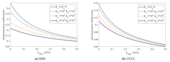 Dimensionless deflection vs. GPL weight fraction, for different elastic foundation coefficients : (a) SSSS boundary conditions, (b) CCCC boundary conditions.