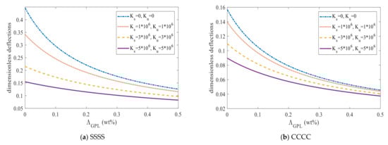 Dimensionless deflection vs. GPL weight fraction, for different Kerr foundation coefficients and : (a) SSSS boundary conditions, (b) CCCC boundary conditions.