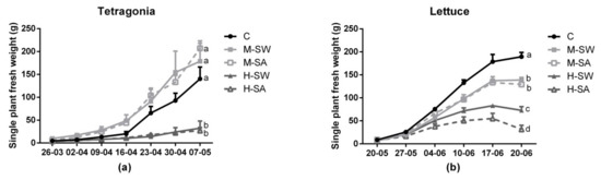 The fresh weight of whole Tetragonia (a) and lettuce (b) plants. Values are single plants’ weight means (n = 4) ± SEM expressed in grams. Different letters at the final sampling indicate significant differences assessed at p < 0.05 (Tukey’s test).