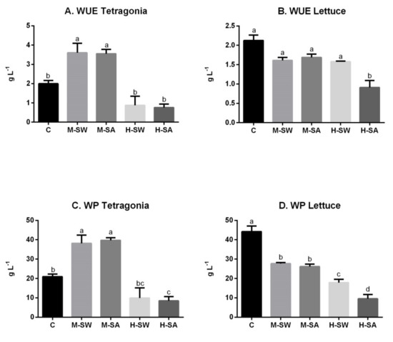 Plants WUE (A,B) and WP (C,D). Values are means (n = 4) ± SEM expressed in grams per liter. Different letters indicate significant differences assessed at p < 0.05 (Tukey’s test).