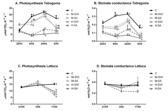 Photosynthetic rate (A,C) and stomata conductance (B,D) of the tested species. Values are means (n = 4) ± SEM measured during the crop cycles. Different letters indicate significant differences at the same recording day assessed at p < 0.05 (Tukey’s test).