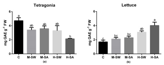 Phenolic concentration in the edible leaves of Tetragonia (a) and lettuce (b). Values are means (n = 4) ± SEM measured at the end of the crop cycles. Different letters indicate significant differences at p < 0.05 (Tukey’s test).