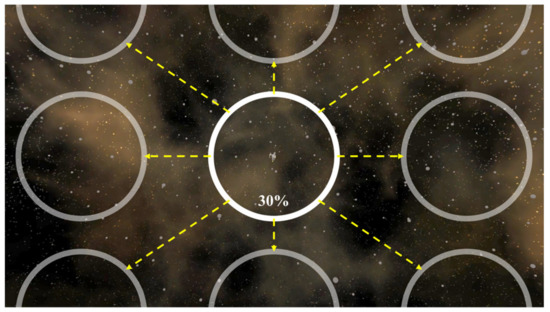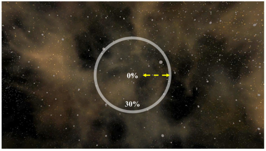 This section describes a visually induced VR sickness reduction method based on a VG. A VG is an independent element in the form of a guide to visually induce gaze movement. This has a role in reducing the level of a user’s concentration on VR sickness’ causes: fast movement and rotation speed of the camera, the complexity of the background, unpredictable object movement, and fast screen transitions. This VG can have various properties in position, size, shape, color, etc. However, it is difficult to determine which of these various properties are most effective for VR sickness reduction In commercial VR games, a VG of white color, circle shape, and 1 pixel line thickness was commonly used. Also, the main properties that directly affect the user’s gaze movement, position and size, were being used in a wide variety of ways. Thus, the color, shape, and the thickness of VG to be used for VR sickness reduction methods were fixed to white, circle, and 1 pixel based on existing references. The remaining two properties (size and position) were set as parameters of VR sickness reduction method.