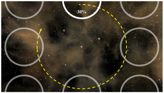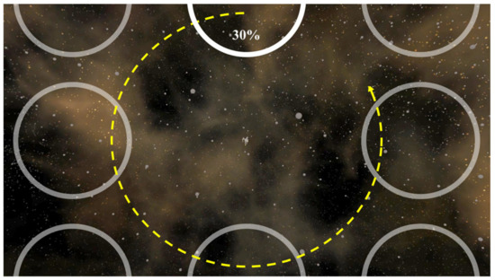 The VG of the third VR sickness reduction method had a size 30% that of the aspect ratio, and a position that moves CW every second along the eight points. This method induced CW gaze movement through the movement of the VG. Figure 3 shows the third VR sickness reduction method (M3).