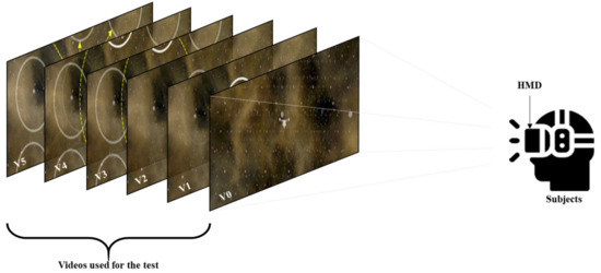 This section describes the experimental environment used to verify the effectiveness of the designed VR sickness reduction methods. The experiment was conducted on 40 subjects in their twenties and thirties (male: 20, female: 20). In the experiment, a 3D VR space-flight video that caused VR sickness was used. This video used for the test was self-produced to cause VR sickness using the camera’s acceleration, deceleration, and rotation (yaw, pitch, roll). Considering that the level of VR sickness increases when exposed to VR content for a long time, the play time of VR video was set to 60 s [14]. Using HTC Vive Pro Eye [15], subjects watched videos with each of the VR sickness reduction methods described in Section 2.1. Figure 6 shows the experimental environment. Table 1 shows the VR sickness reduction method used in experiment.