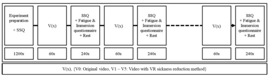 Before the experiment, subjects answered the SSQ for sickness condition measuring and performed calibration for eye-tracking after wearing VR HMD. In the experiment, a total of six videos (V0: original video; V1–V5: videos with VR sickness reduction methods using VGs) were used. At the end of each video, which was provided for 60 s, subjects had time to respond to the SSQ and the questionnaire on fatigue and immersion. The questionnaire on fatigue and immersion was conducted by subjects answering whether they felt fatigue or immersion for V1–V5. After answering the questionnaire, subjects had a rest time to relax VR sickness. Also, the original video (V0) without VR sickness reduction method and videos with VR sickness reduction method (V1–V5) were randomly placed to ensure reliability. Experiments were conducted using the protocol shown in Figure 7 for each VR HMD video. Also, in Figure 7, the V(x) symbol was used to represent the randomly placed videos (V0–V5).
