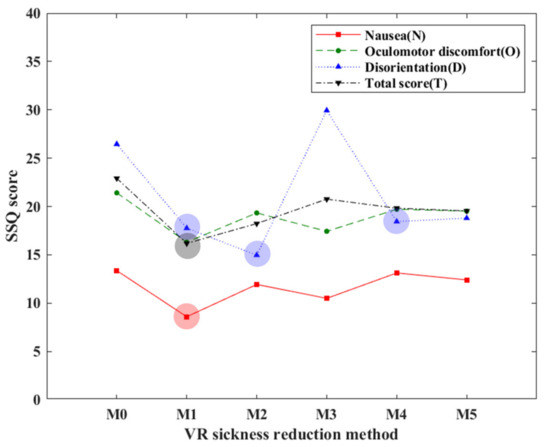 Figure 8 shows a graph comparing SSQ score of VR sickness reduction methods. M1 showed the greatest reduction in nausea, disorientation, and total score (Circle in Figure 8). Furthermore, M2 and M4 showed significant reduction in disorientation (Circle in Figure 8). Other VR sickness reduction methods such as M3 and M5 did not show significant reduction effect. Therefore, it was confirmed that the most effective method for reducing VR sickness is M1.