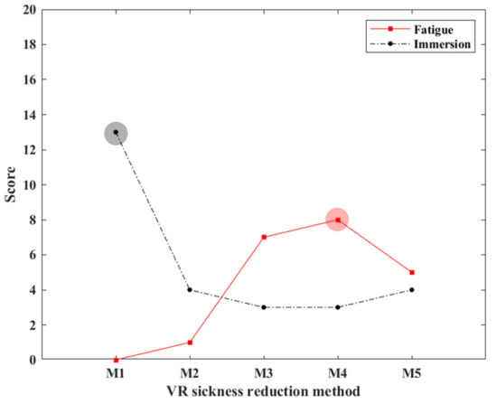 Figure 9 shows a graph comparing fatigue and immersion scores of VR sickness reduction methods. While M4 had the lowest immersion and the highest fatigue (Red circle in Figure 9), M1 had the highest immersion and the lowest fatigue (Black circle in Figure 9). These results indicate that M1 has an effect on VR sickness reduction and induce to relatively low fatigue and high immersion.