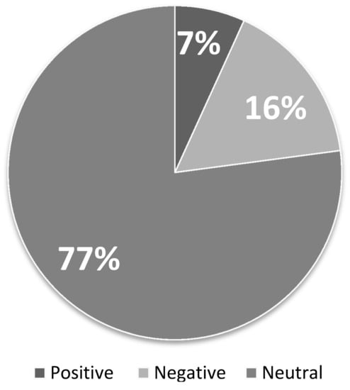 Next, from the total of 1317 primary information tweets, we randomly extracted 1000 and classified them into three categories: positive, negative, or neutral. Objective opinions were considered as neutral. For the results of the classification, out of 1000 tweets, there were 68 (7%) positive tweets, 771 (77%) neutral tweets, and 161 (16%) negative tweets (see Figure 3).