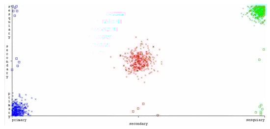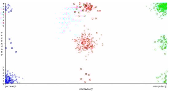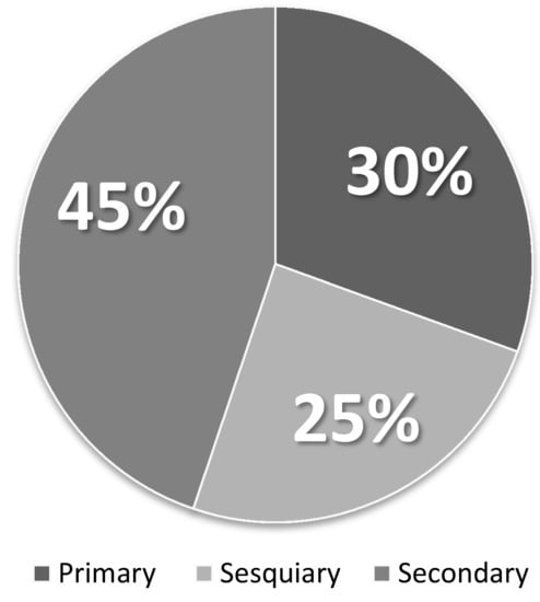 From the obtained data, we extracted 93 official retweets as secondary information, and from the remaining 22,083 we randomly extracted 2000 tweets for classification. The average length of election tweets this time was 45 characters, which is approximately 15 characters longer than in usual tweets. This means that election tweets contain more information in general. Primary information was represented by 711 tweets (36%), sesquiary information by 933 tweets (47%), and secondary information by 286 tweets (14%) (see Figure 7).