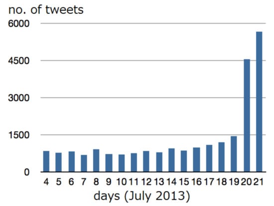 The popularity of Twitter has also made it an effective instrument for tracking social tendencies. Therefore, much research has currently been actively conducted using data obtained from Twitter [,,,,,,]. For example, Kuwano et al. [] extracted tourist information from Twitter, or Umejima et al. [] made an attempt to prevent the spread of false rumors by analyzing the phenomenon of Twitter hoaxes. Moreover, Aramaki et al. used Twitter to predict the spread of influenza []. In addition, Twitter has been considered an effective tool in information transmission during emergencies, such as the Great East Japan Earthquake which occurred on 11 March 2011 []. In a more recent study, Karami et al. [] proposed an analytical framework for Twitter Situational Awareness, in which they used text-mining methods, such as sentiment analysis and topic modeling, for disaster preparedness and response.