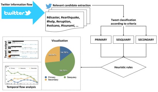 After validating the approach, we propose a system for automatic classification of tweets into primary, sequiary and secondary. To optimize the system, we compare its performance on multiple feature sets and a number of classifiers. Finally, we test the system on completely new data, containing tweets obtained after an eruption of a Japanese volcano Ontake on 27 September 2014.