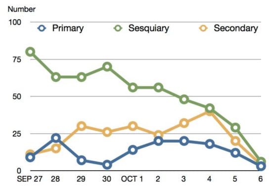 The primary information was represented by 1539 tweets (26%), secondary information was represented by 2083 tweets (36%), and other kinds of information not coming under the definition of either primary or secondary information was represented by 2227 tweets (38%) (Figure 1). Examples of each type of information were represented in Table 1.