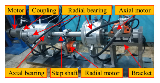 The structure of MLDSB test stand is composed of motor, coupling, radial bearing, axial bearing, axial motor, radial motor, step shaft, bracket as shown in Figure 1.