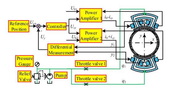 where, FLy is hydrostatic force in y direction [21]; ps is oil supply pressure; Ae is bearing area of supporting pocket. Ab is extrusion area of supporting pocket; Rhj is liquid resistance of oil pocket; μ is oil viscosity; h0 is liquid film thickness; is flow coefficient [22]; θ is Angle between supporting pocket and centerline of rotating shaft. Β is throttling ratio; FMy is electromagnetic force in y direction [23]; iMy,j is input current; i0 is bias current; μ0 is vacuum permeability; S is area of magnetic pole; N is turn of electromagnetic coil; l is plating thickness; kp and kd are proportion and differential coefficients. Fn is radial impact force [24]; kn is radial stiffness; G is rotor weight.