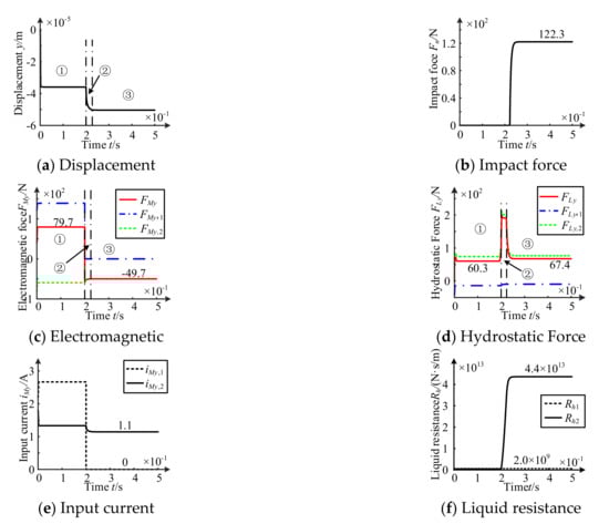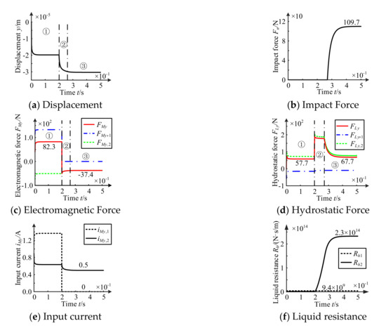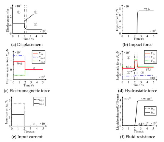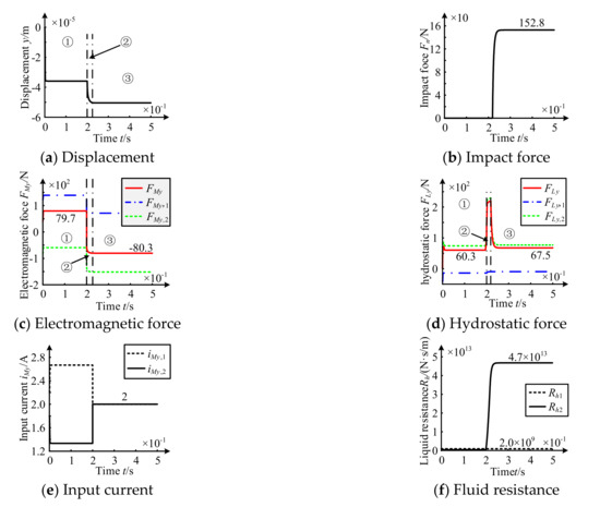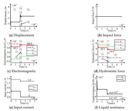 According to Figure 7, in the initial equilibrium stage, the rotor drops from the zero position and stays at −35.9 µm, and the external load is borne by electromagnetic force and hydrostatic force as shown in Stage ①.