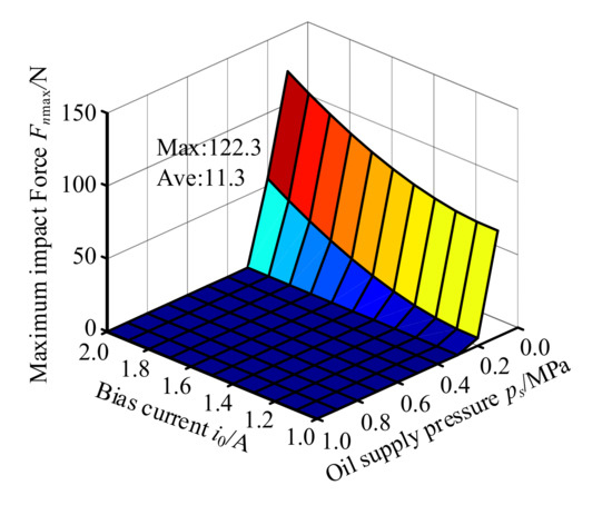 According to Figure 6, collision between rotor and stator is triggered when ps < 0.3 MPa. Maximum radial impact force Fnmax decreases with the increase of the oil pocket pressure and the decrease of the bias current. The maximum value appears when ps = 0.1 MPa, i0 = 2.0 A. Therefore, take it as a typical example in order to analyze operation rules as shown in Figure 7.
