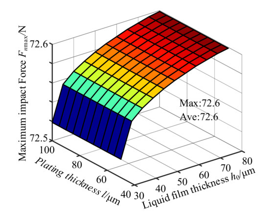 According to Figure 9, maximum impact force Fnmax changes very little within the range of selected structural parameters, ranging from 72.5 to 72.6. It will be invariable with the change of plating thickness, but increases with the increase of liquid film thickness. The maximum value of Fnmax occurs in the combination of h0 = 80 µm and l = 50 µm. Therefore, take it as a typical example in order to analyzing operation rules as shown in Figure 10.
