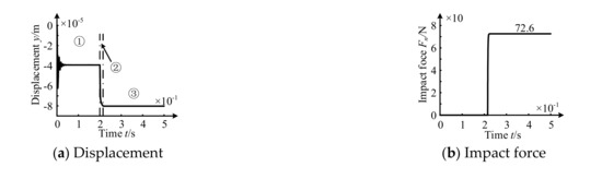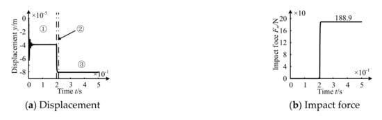 According to Figure 5, the upper unit failure occurs at t = 0.2 s, and the motion of rotor includes three stages: initial equilibrium, dropping, and collision.