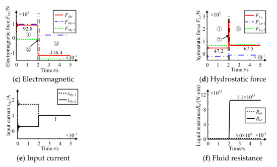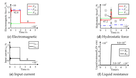 In final equilibrium Stage, rotor stabilizes at −16.7 µm. The current iMy,1 of the supporting unit 1 decreases to 1.4 A, leading to the electromagnetic force FMy,1 reducing. However, due to FMy,2 becomes 0, total electromagnetic force FMy rises to 106.0 N. The liquid resistance Rh1 and Rh2 are respectively stable at 6.6 × 109 N·s/m and 4.4 × 109 N· s/m. In addition, hydrostatic force FLy drops to 34.0 N. The rotor load is borne by both electromagnetic force and hydrostatic force as shown in Stage ③.