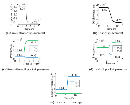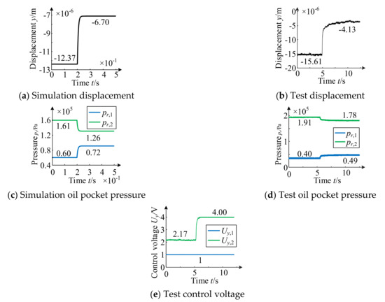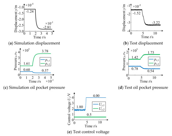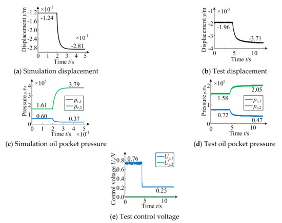 In order to improve the stability of the electronic control system, the unilateral control strategy is adopted to the control voltage of the electromagnetic system on the test stand. The control voltage is only input to one of the upper or lower units, and the other side is only input to the bias voltage or no voltage input. Therefore, when the displacement sensor detects the gradual decline of the rotor, the upper unit continuously increases the regulation voltage to increase the electromagnetic attraction to prevent the rotor rubbing trend. As the electromagnetic coil circuit of the upper unit is manually disconnected, the electromagnetic attraction is zero, and the rotor keeps falling until the control voltage of the upper unit reaches the limit value of 4 V as shown in Figure 22e. Then the rotor continues to move down until the hydrostatic system balances the rotor and reaches the new balanced state again.