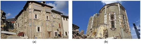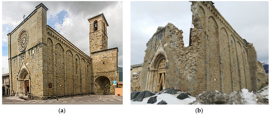 The 2016 Central Italy earthquake, which caused the total destruction of Amatrice and many other historic villages around it, highlighted the vulnerability of historic buildings due to decay, an absence of anti-seismic devices and poor maintenance in the masonry structures. The buildings of Amatrice were characterized by sandstone and marl stones of low strength, but, above all, poor in calcium carbonate. Since the production of lime took place with stones quarried in the same sites from which the building stones were obtained, they were capable of giving only “poor” lime. From this lime, a mortar, as the binder of the masonry, was obtained with low calcium content, which over time degraded more rapidly, no longer binding the stones of the masonry. In particular, one of the symbolic damaged buildings in the historic center of Amatrice was the St. Agostino church, a Romanesque-Gothic construction built in 1428 (Figure 1a), which suffered an almost total collapse that occurred in progressive phases during the long seismic earthquake swarm after the first violent earthquake of 24 August 2016 (Figure 1b) []. The façade was composed of sandstone, and the interior was made from a single nave with a wooden roof and exposed trusses.