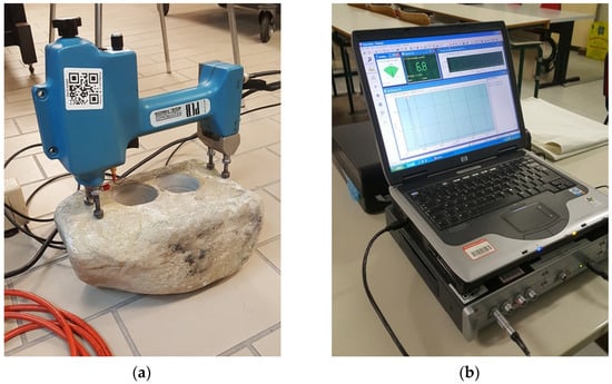 Ultrasonic tests were also conducted on the same stones to estimate the dynamic elastic modulus (Ed). Ultrasonic inspection is a non-destructive method, in which high frequency sound waves are introduced into the material to be examined, in order to highlight any surface or internal defects. Longitudinal waves were produced by means of an electro-acoustic transducer (emitting probe in piezoelectric or magnetostrictive material) placed in contact with the stone surface under test; after passing through a path of known length, the train of waves was converted by a second transducer (receiving probe) into an electrical signal processed by electronic timing circuits that allow measurement of the transit time of the impulses. The ultrasonic test device consisted of: a Proceq Tico® pulse generator; two transducers of 54 kHz (one emitting and the other receiving); a pulse amplifier; and an electronic device for measuring the time interval (Figure 4). The speed of the wave (v) depends on the presence of any defects inside the material, and is related to the value of the dynamic elastic modulus (Ed) through the density (ρ) and the Poisson’s ratio (ν) of the material. Therefore, the value of the dynamic elastic modulus (Ed) of the stone can be obtained using the following relationship, in accordance with the technical standards ASTM D2845 1995 and UNI EN 12504-4: 2005 [,]: