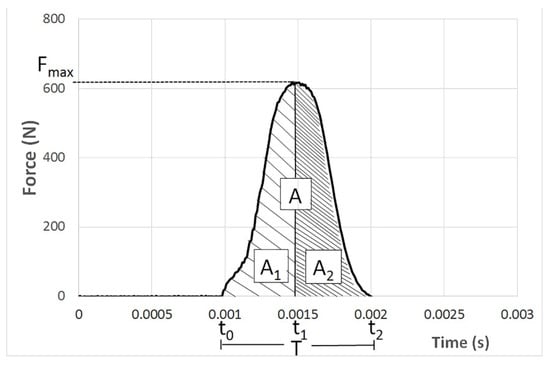 The parameters in Equations (2) and (3) were the following: A1 was the area beneath the diagram (F, t) corresponding to supplied energy (see Figure 6), T represented the time in which the contact occurs between the two surfaces; R was the radius of curvature (10 mm) of the impact mass m (0.207 Kg), E0 was the mass elastic modulus (222,000 MPa), and ν0 was its Poisson’s ratio (0.2), while, with regard to the stone material, a Poisson’s ratio of 0.2 was considered [,].