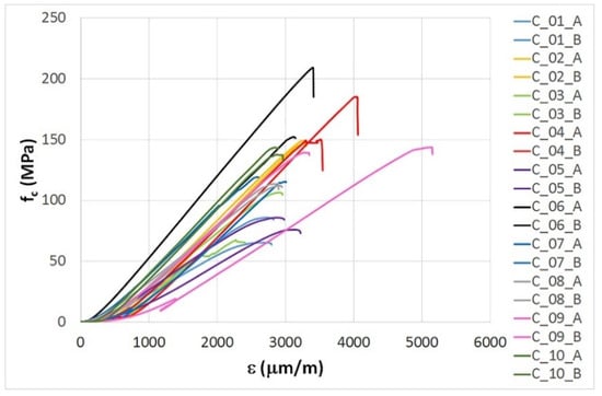 For the assessment of the stone mechanical characteristics and the wall texture of the St. Agostino church, 10 stone samples were taken in situ from the rubble that resulted from the collapse. For each stone, 2 cylindrical specimens were obtained with a diameter of 50 mm and height of 100 mm (Figure 3a). The top and bottom surfaces of the cylindrical specimens were mechanically rectified to make them coplanar to the test machine plates, and they were arranged between the press platens without the interposition of friction-reducer layers. The compression tests were carried out using a Baldwin–Zwick 500 kN material testing machine, in accordance with the Italian technical code UNI EN 1926: 2007 [], by applying a monotonically increasing axial load (force control 1 MPa/s) until failure (Figure 3b).