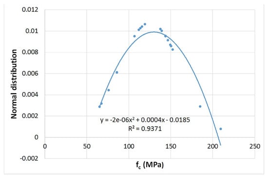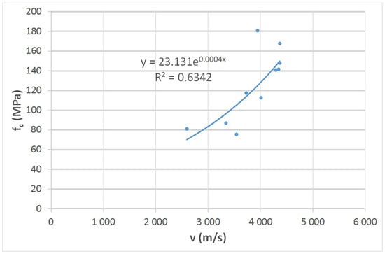 In order to validate the potential of non-invasive tests only, in the wake contributions made by other authors [,,], the following exponential correlation was obtained (Figure 11) between the ultrasonic speed (v), and the cylindrical compression strength (fc):