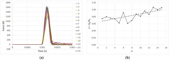 Impact test on stone n. 4: (a) time–force diagram of the 15 beats; (b) trend of the restitution coefficient (e) vs. number of beats (n).