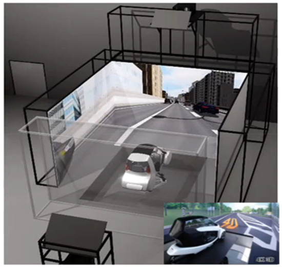The study was conducted using the immersive driving simulator (DS) with stereoscopic vision at Nagoya University (Figure 1). A realistic cockpit with all necessary equipment was installed on the 6DOF motion platform which is capable of noticing the driver about the generation of acceleration due to the driving operation [18]. The DS used a stereoscopic image on the immersive display where the cabin was located in a square room where the floor and walls were used as screens for projecting 4K resolution images of the driving scene. The image projected on the screen is a stereo image that takes into account the parallax of the left and right eyes, and by using a head tracking system that measures the position and orientation of the person’s head, the image is displayed from a viewpoint that matches the position of the person. The immersive display offers binocular parallax stereoscopic vision and motion parallax stereoscopic vision, and faithfully reproduces the sense of depth and distance [19]. With these unique functions, the DS can provide a driving environment that seems more natural than any existing conventional DS.