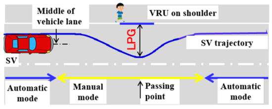 The LPG indicates the safety gap perception of drivers when they overtaking VRU. The upper panel of Figure 4 shows that the average LPG profiles for all four types of drivers were bigger than the gap at the beginning of manual mode. So, drivers, normally do not ignore the existence of VRU even when they were in the walking/cycling lane. Despite type B’s gap profile gradually increased from the beginning, the gap profiles of others started increasing when longitudinal displacement from SV to VRU was about 40 m.