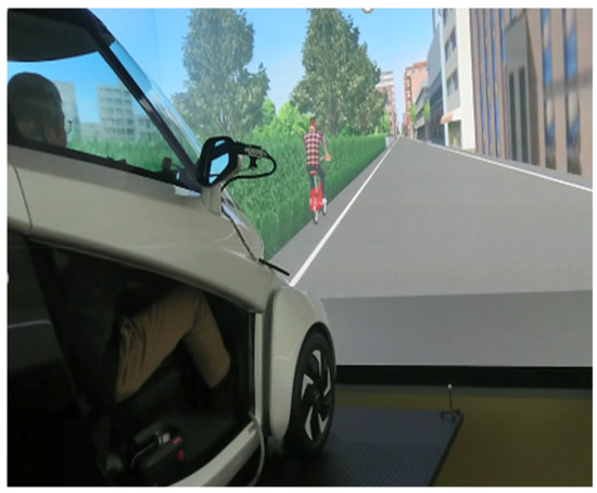 An image of the experiment is reported in Figure 3 that shows the VRU traveling on the left side, in the middle of the shoulder. During the overtaking maneuvers (in manual mode), the drivers could decide their speed and gap to the VRU. There was a break time of five minutes between each drive. The experiment time is about 1.0 to 1.5 h.