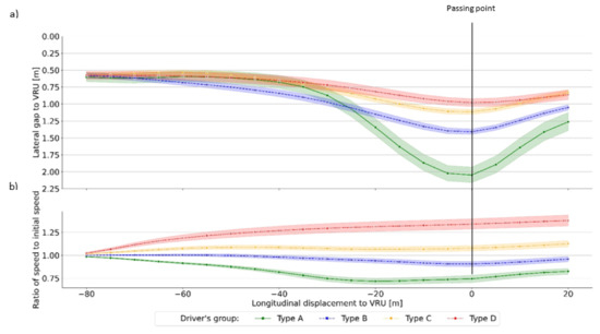 For all types, the initial speed had a statistically significant effect on how the drivers regulated their vehicle speed. This finding can be explained as the perception of collision to VRU is different across velocities: the higher the speed, the smaller the time-to-collision for drivers to consider the situation and decide to take a maneuver. Moreover, for type A drivers, there was no difference in overtaking strategies between the initial speed of 30–40 km/h. Type D drivers’ strategy was different only in the case of an initial speed of 60 km/h.