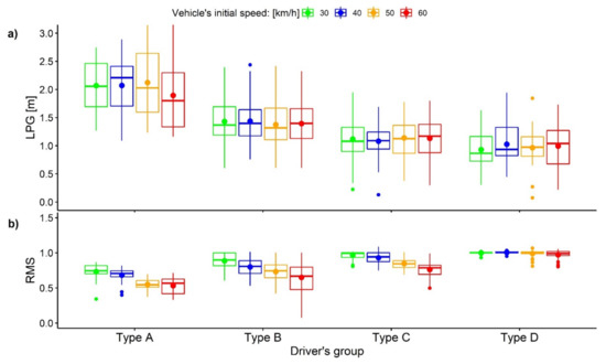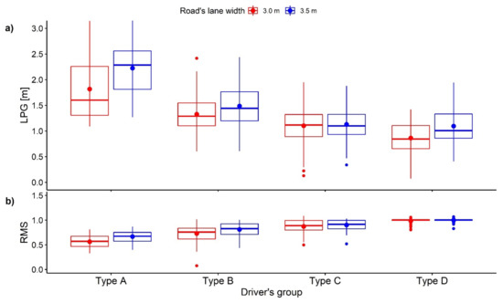 For further knowledge of the main influence of road’s lane width, vehicle’s initial speed, VRU type, and location on behavior (LPG, RMS) of each driver’s group, the analyses of variance with repeated measures (Repeated Measures ANOVA tests) were conducted with a significance level of 0.05 [22]. The LPG and RMS were confirmed to be approximately normally distributed using Shapiro–Wilk normality test. Mauchly’s sphericity test was conducted to validate the sphericity assumption. In case of violation, the degrees of freedom were corrected by Greenhouse–Geisser procedure. Tukey’s Honest Significant Difference tests (TukeyHSD tests) were used as post hoc tests to assess the significance of differences between pairs of group means [23]. Boxplots were used to envision and compare the LPG and RMS of each group.