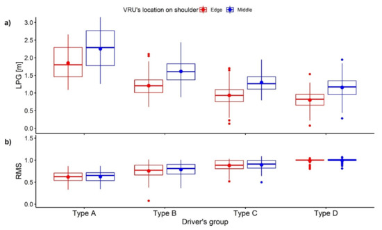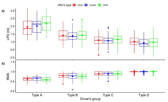 Figure 4 showed profiles of sample means and 95-percent confidence interval (95% CI) of population means of the lateral gap from SV to VRU and ratio of SV speed to initial speed for each type of driver. In increasing order, the 95% CI of lateral passing gap means of type D, type C, type B, type A drivers were [0.921, 1.03] m, [1.08, 1.15] m, [1.37, 1.45] m, [1.92, 2.17] m, respectively. The drivers in type B and type C chose to drive closely to the initial speed. Their 95% CI of the ratio of minimum vehicle speed to initial speed were: [0.752, 0.790] and [0.873, 0.889], respectively. Their 95% CI of the ratio of passing speed to initial speed means were: [0.875, 0.935] and [1.05, 1.11], respectively. On the one hand, drivers in type D preferred speeding from the beginning. 95% CI of their ratio of minimum speed and passing speed to initial speed of road were: [0.984, 0.999] and [1.29, 1.39], respectively. On the other hand, type A drivers always reduced speed. Their 95% CI of the ratio of minimum speed to initial speed was [0.592, 0.652]. They passed the VRU at the ratio of passing speed to initial speed mean of 95% CI [0.702, 0.786]. Table 2 provides descriptive statistics of LPG, RMS that outline the data of each group. Figure 5, Figure 6, Figure 7 and Figure 8 show the box plots related to LPG and RMS for all types in different conditions of lane width, SV’s initial speed, VRU type, and location, respectively. Overall, the mean profiles were different for each group of drivers.