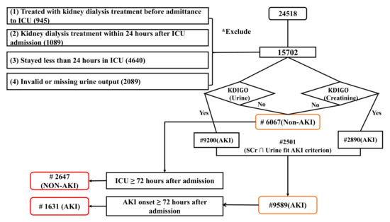Taichung Veterans General Hospital (TVGH) is a tertiary teaching hospital with 112 adult ICU beds in central part of Taiwan. 24,518 adult ICU admissions between July 2015 and December 2019 in the TVGH EHRs database were extracted for analysis. The inclusion criteria is age over 20 years old adults. Exclusion criteria are (1) End stage renal disease with the International Classification of Diseases Tenth Revision (ICD-10) code assignment of N18.6. (2) Had been treated with renal replacement therapy before the index ICU admission. (3) Received renal replacement therapy within 24 h after index ICU admission. (4) Stayed less than 24 h in ICU. (5) Had an invalid or missing urine output (UO) record. After selection, 15,702 adult ICU admissions were included for final analysis.