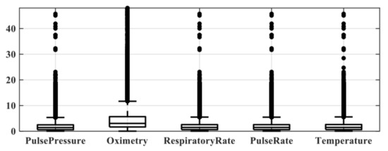 For the vital signs stated in Section 2.4, the Shannon entropy was calculated. We also calculated the mean and variance for each vital sign V. Table 2 summarizes the feature generation for vital signs V. Let denote the mean and variance of vital signs V and denote the entropy of vital signs of V; then, is the combination of both and .