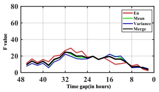 Figure 6 shows the F value from F test of AUROC along with the time gap. The F value on AUROC showed that the peak in F value was at 30 h; namely 30 h was the point that contributed the most information and was the turning point from slight AKI signs to emerging AKI oscillation. Therefore, clinicians may consider the patient has higher risk of having AKI onset. The overall model performance increased drastically, when starting at this point in time. The trend was most obvious in NRI for both and . As the NRI seeks to quantify whether a new marker provides clinically relevant improvements in model prediction, this result indicates that when passing the critical point of 30 h, the shorter the time gap and the more information available, the better the models performed.