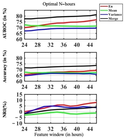 In terms of NRI, was the highest among other features after 32 h. This implied that the increase in feature window had a high impact on model performance, such that the performance was more sensitive to the length of feature window and data availability. The model performance of was sensitive to the feature window size of 24 h to 36 and 38 to 48 h of feature window size. was not sensitive to feature window variance. Similar behavior was found in , the amount of available data was critical to between 24 to 30 h of feature window size In comparison, despite the fact that performed well, in terms of accuracy, we drew the same conclusion as for AUROC; that is, improved drastically with more data and a longer feature window. The NIR showed that is steadily sensitive to data availability.