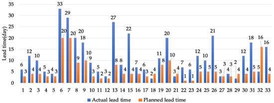 In the shipbuilding industry, an essential part of scientific management is lead time, which is necessary for shipyards to arrange production plans, particularly in production organization and progress of production control [1,2]. Additionally, lead time is closely related to the production efficiency of frontline manufacturing workers. The rationality of its arrangement directly affects workers’ production enthusiasm, thereby affecting product quality and labor productivity [3]. For example, if the evaluation of lead time is insufficient and management has not prepared the appropriate plan for construction peaks, the construction cycle will be prolonged. Here, to avoid affecting the construction cycle, workers must operate overtime for long periods, resulting in a decline in construction quality. Conversely, if the evaluation of lead time is overestimated, it results in excess construction capacity problems and human resource waste [4]. Consequently, lead time should be arranged reasonably, which means that the planned lead time must be as close as possible to the actual lead time in the shipyards’ production planning stage. However, because the shipbuilding industry is a labor-intensive industry, this has resulted in a significant difference between planned and actual lead times (Figure 1). Therefore, to rationalize the lead time arrangement, lead-time prediction becomes particularly critical [2,4,5].