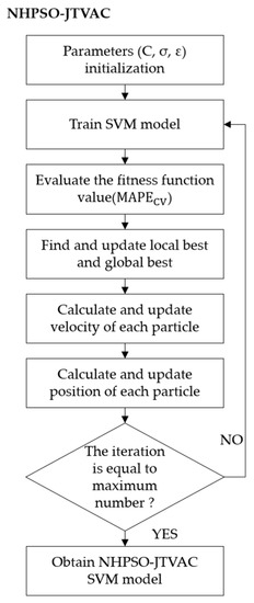 To select the appropriate parameters for an SVM, the NHPSO-JTVAC algorithm proposed in Section 2.2.2 was applied to optimize the parameters of the SVM. Figure 2 illustrates the SVM flow chart based on the NHPSO-JTVAC algorithm.
