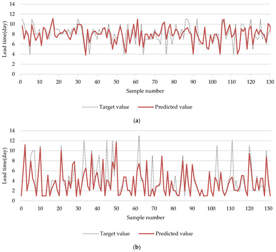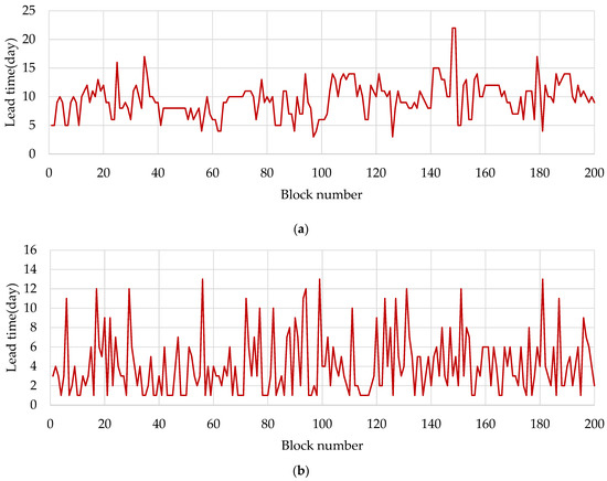 The target value (label) of each dataset was the lead time. A part of the original dataset is shown in Figure 4a,b.