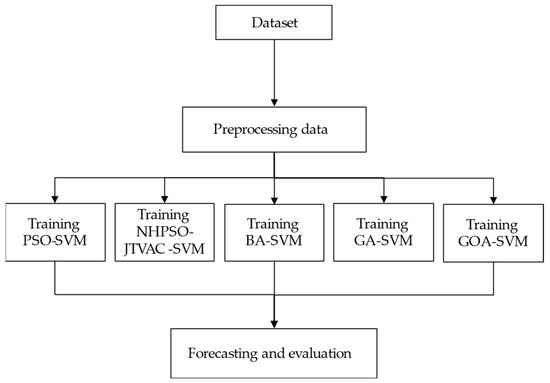 In all the algorithms, the population size was unified and set to 20, and the number of iterations set to 500. The search space dimension of each algorithm was set to 3, which represented the three parameters (, , ) of the SVM. The search range of was set to [, ], was set to [,], and was set to [,]. The remaining parameters of the NHPSO-JTVAC were set as listed in Table 3. Furthermore, the initial parameters of PSO, GA, BA, and GOA were set as listed in Appendix A (Table A1).