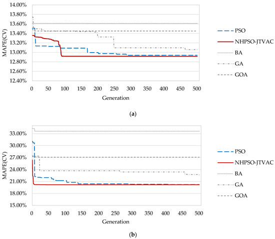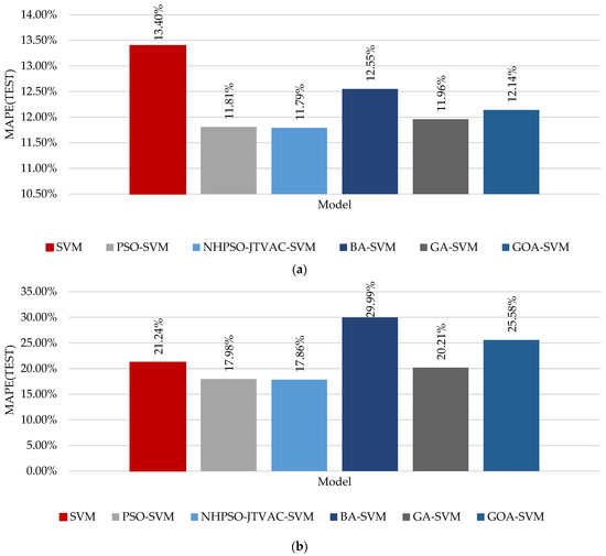 Table 8 lists the average MAPE values based on two datasets and obtained using SVM, PSO-SVM, NHPSO-JTVAC-SVM, BA-SVM, GA-SVM, and GOA-SVM. The average MAPE for the NHPSO-JTVAC-SVM model was 14.83%, which was the smallest among the AI models. Furthermore, Figure 9 shows the predicted results of the test set for different datasets, wherein the NHPSO-JTVAC-SVM model was superior in solving the lead-time-prediction problems.