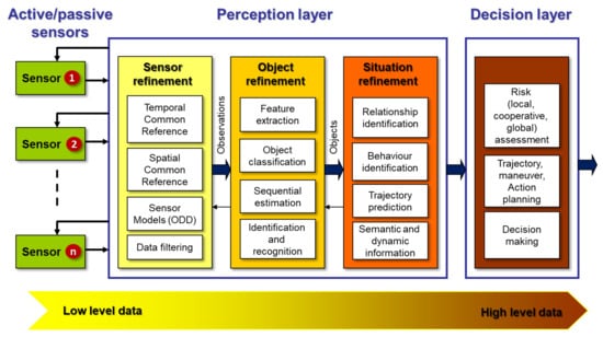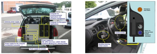 In the last 20 years, the transportation paradigm has evolved in order to improve road safety, minimize energy consumption and pollutants emissions, and optimize traffic conditions [,]. One of the key solutions is the development and deployment of automated mobility (level 3 to 5 of SAE (Society of Automotive Engineers) standard). With the expected functionalities of such automated systems, the mobility concepts will strongly and radically evolve. Technologies are a crucial issue in the development of this new generation of mobility means. Technology issues are not only focused on new powertrains, new hardware architecture, or new types of efficient embedded sensors for Autonomous Driving Systems (ADS) (i.e., radar [], lidar, IR-neuromorphic-UHD-Polarized-Stereo-Fisheye cameras, GPS [], etc.) but also on new methods, approaches and algorithms in order to process the data coming from information sources (sensors, HD Maps, communication). Artificial Intelligence (AI) takes an increasingly important role in the “onboard intelligence” []. Thus, sensors provide information to the perception layer which allows to assess the attributes of the road key components (obstacles, road, ego-vehicle, environment, and driver). This perception information allows building dynamic local perception maps, which can then be extended by sharing data using specific Vehicle to Vehicle or Vehicle to Infrastructure communication protocols. From these maps, decision module and path planning methods can be implemented in order to drive vehicles automatically and safely without any human active operation (see Figure 1).